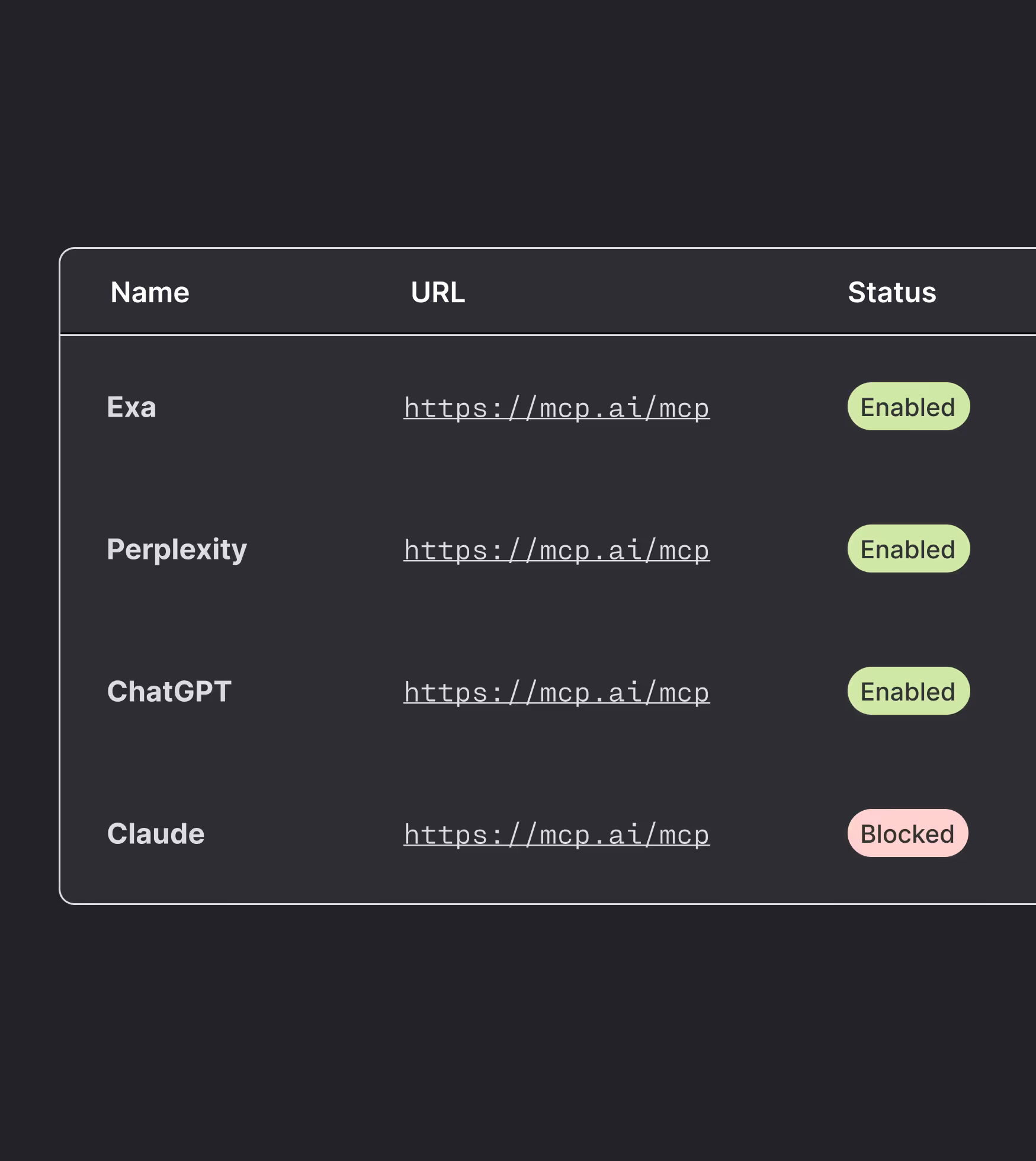 Map and control every MCP server across your environment. Enforce which servers are allowed, what they can do, and who can invoke them.