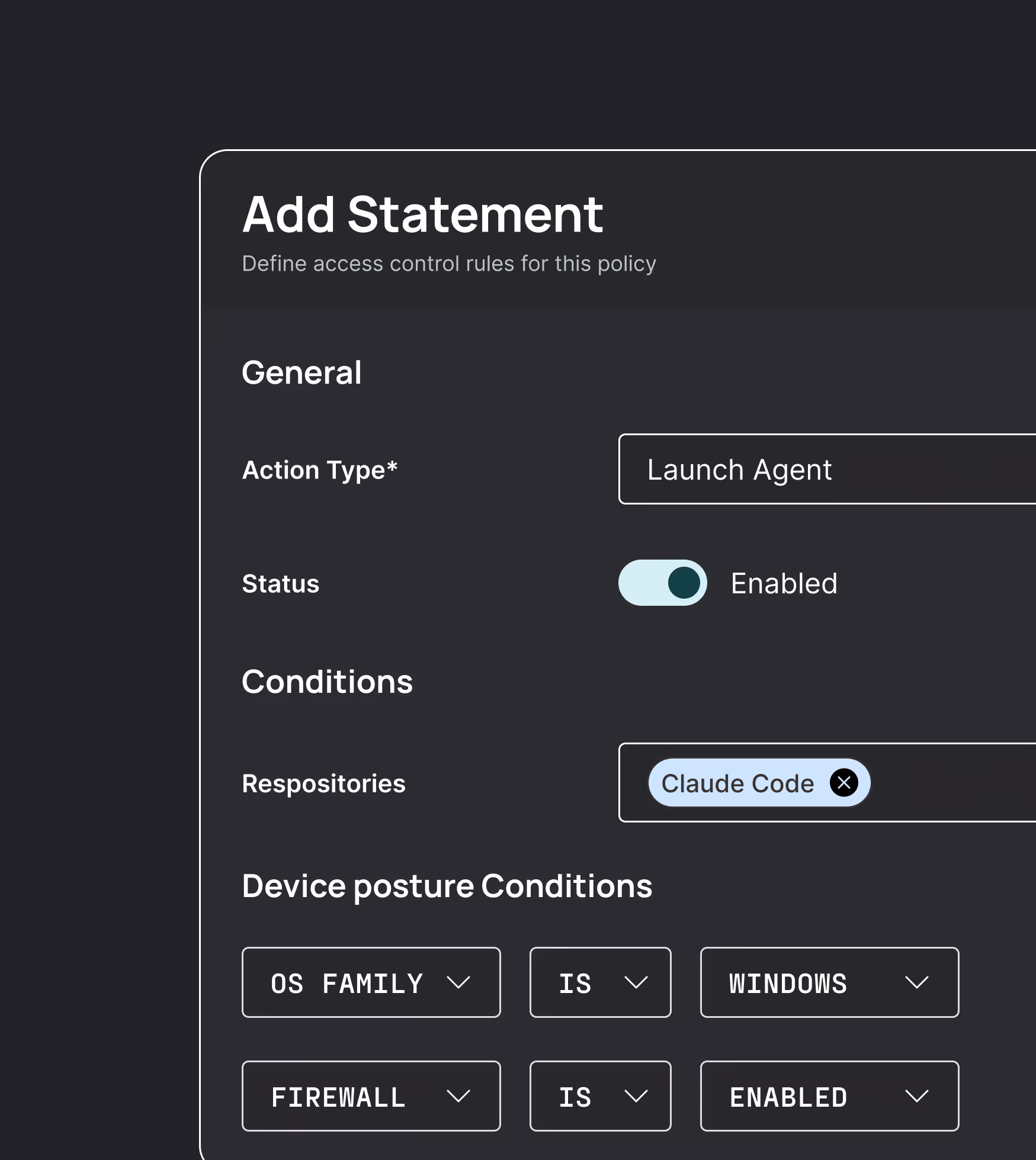 Apply device trust verification to agent infrastructure. Managed or unmanaged, cloud or on-prem, every device must meet your posture requirements.